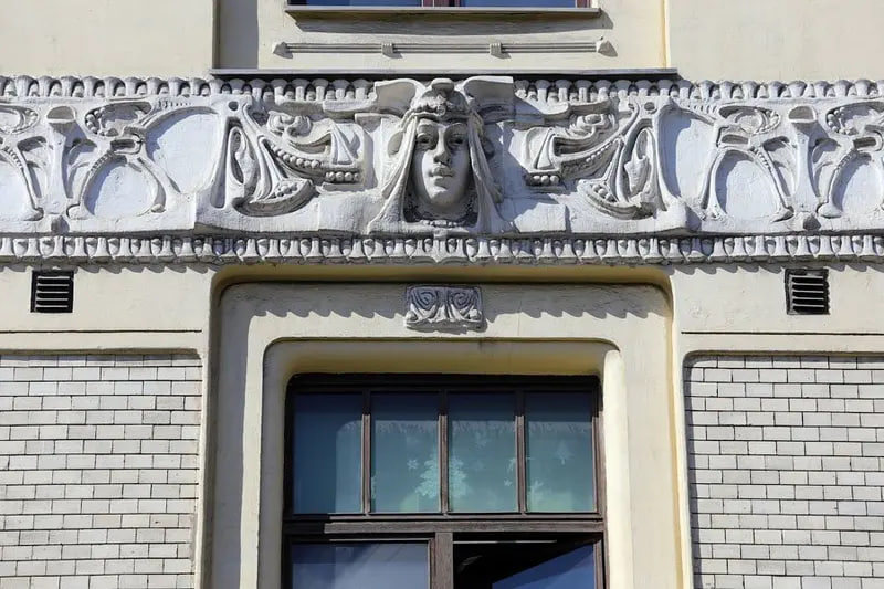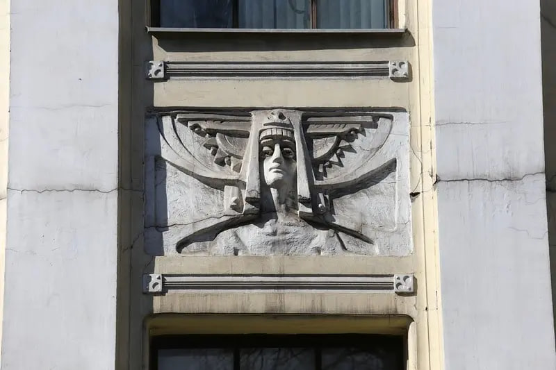 Египтизирующий стиль был популярен в начале ХХ века. Лица в виде барельефов — маскароне — в архитектуре имеют символическое значение, чаще всего подчёркивают функцию сооружения. Изначально маскароны имели сакральную функцию — оберегали храмы, а в эпоху модерна маскароны с женскими лицами становятся главными украшениями фасадов особняков московского купечества и доходных многоквартирных домов. Наличие таких барельефов указывало на статус владельца и подчеркивало индивидуальность архитектурного сооружения.