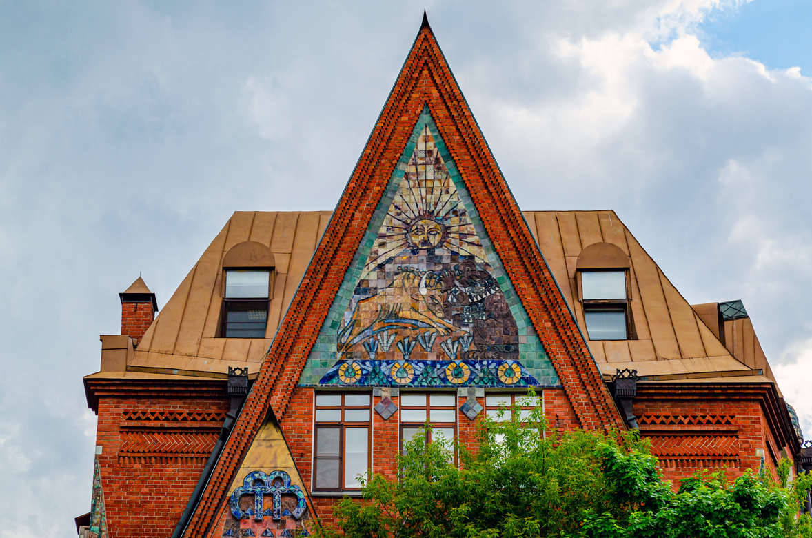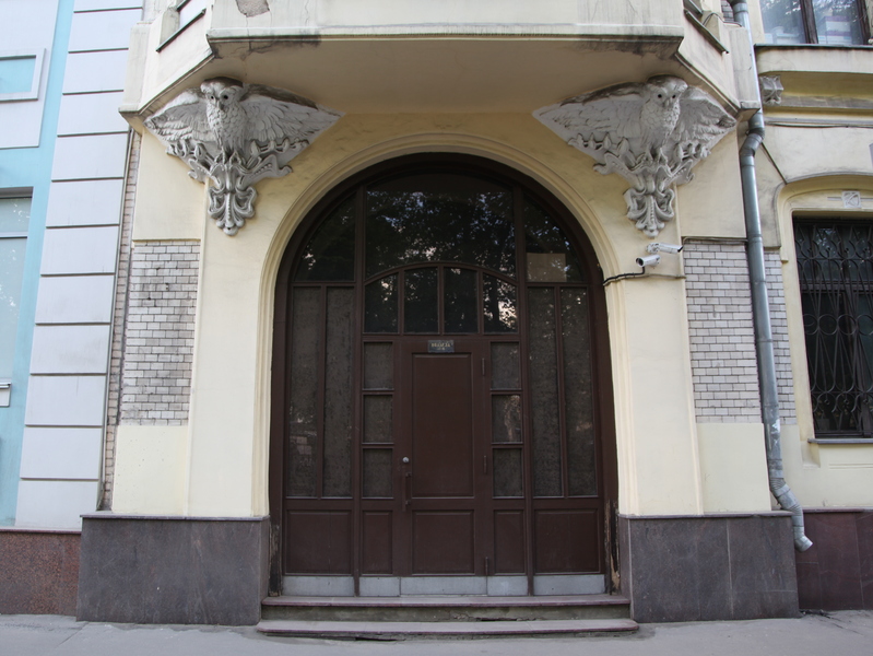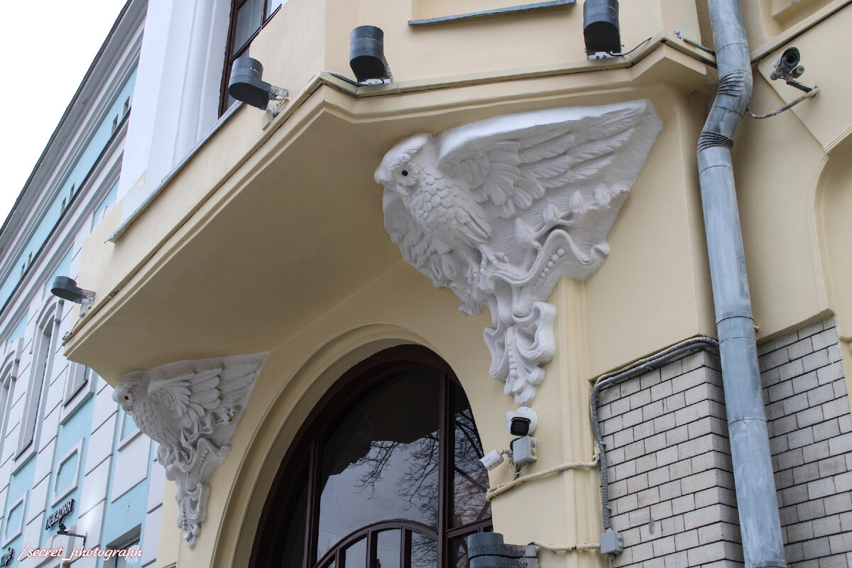 над входом со стороны Соймоновского проезда можно увидеть резное изображение вещей птицы Гамаюн с женским лицом — согласно славянской мифологии, она предвещает будущее.