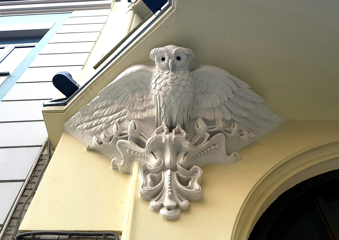 Сова, в первую очередь, символизирует мудрость и знания. Есть и другие ассоциации: интуиция, таинственность, проницательность. Здесь они выполняют роль атлантов, на плечах крыльях которых держится эркер, используются как символический элемент. В древнегреческой традиции сова считалась спутницей богини мудрости Афины.