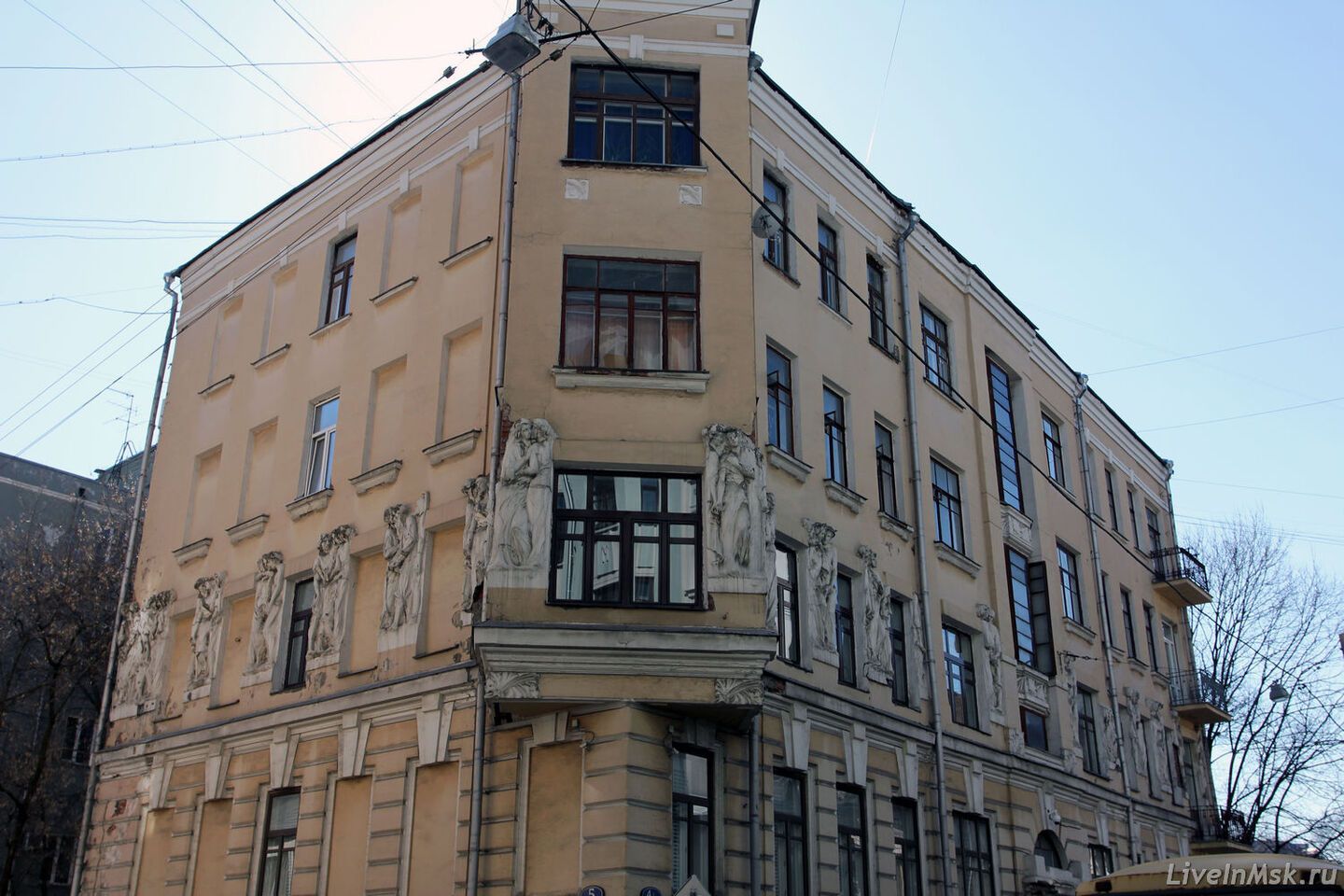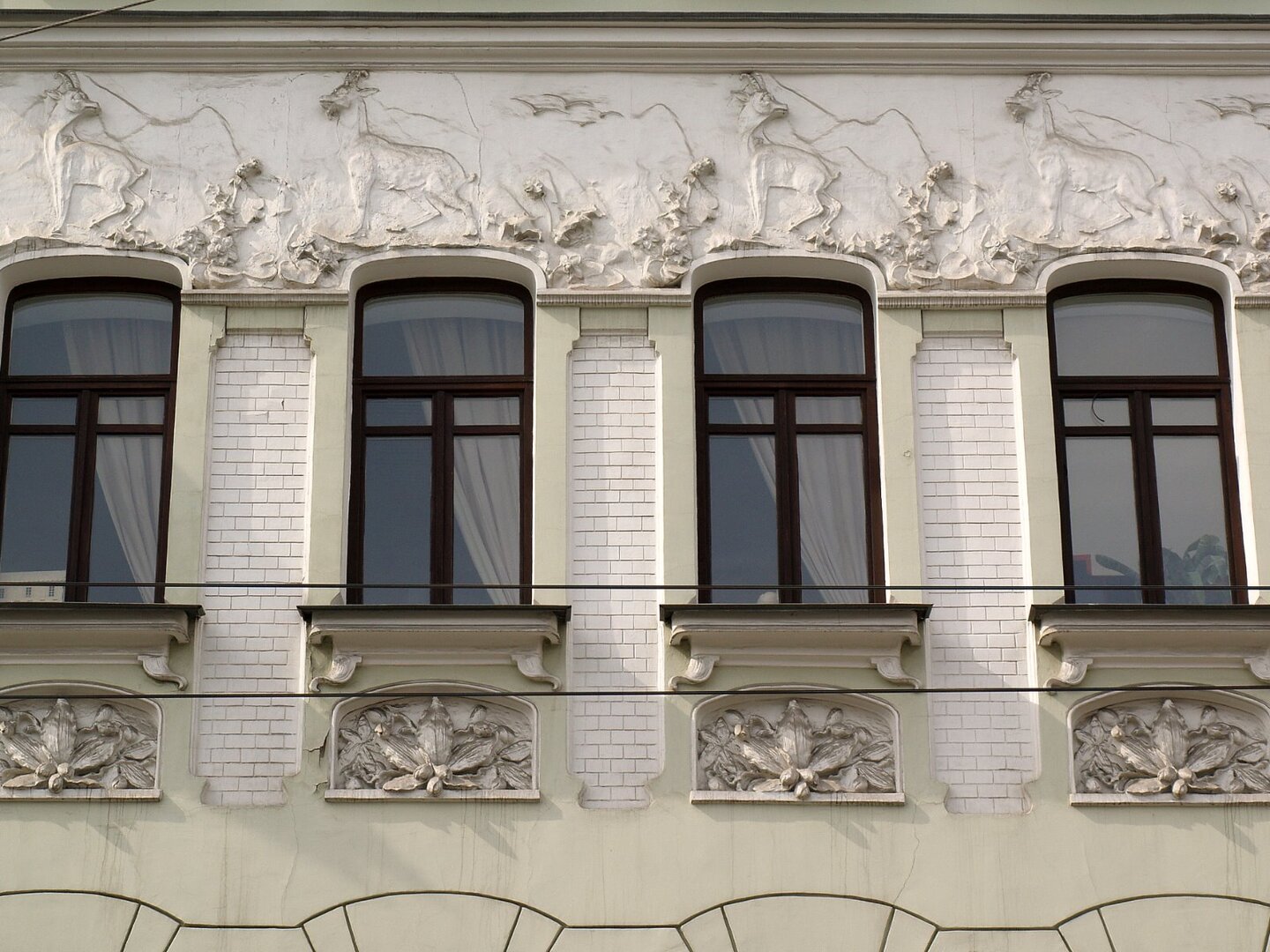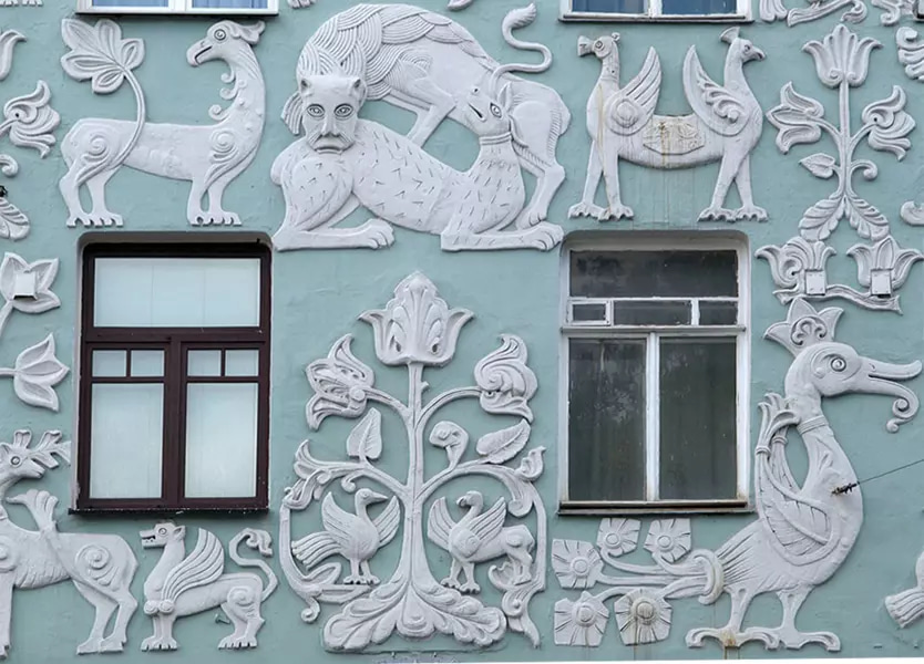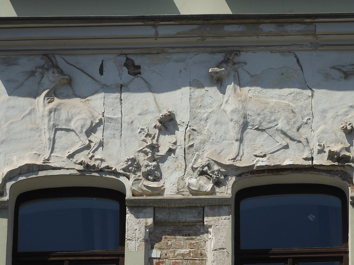 Зооморфный фриз, установленный между третьим и четвертым этажами доходного дома. Изображены антилопы и стаи летящих птиц.