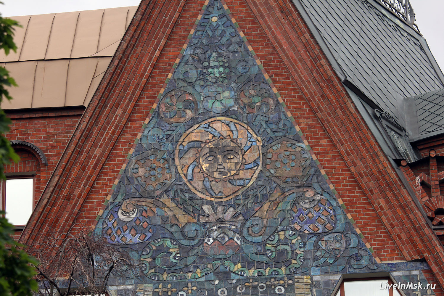 Одно из ярких украшений — панно, изображающее битву быка и медведя. За противостоянием наблюдает солнце — бог Ярило. Это один из сюжетов древнеславянской мифологии, где медведь олицетворяет бога богатства и урожая Велеса, а бык — Перуна, бога-громовержца.