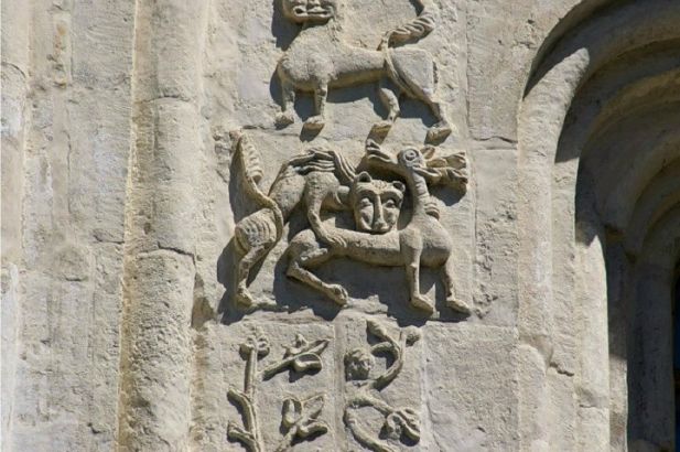 Лев терзающий оленя на Дмитровском соборе, барельефы на Доходном доме