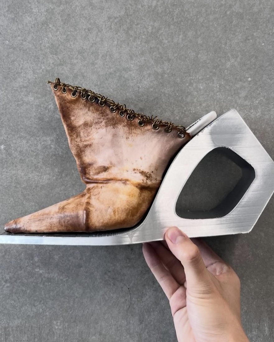 Второе направление посвящено роли формы и конструкции. Скульптурность, смещённые пропорции и архитектурность превращают обувь в самостоятельный элемент дизайна, способный менять восприятие тела и задавать характер всей композиции. Здесь обувь выступает как малая архитектурная форма — объект, где важны баланс, объём, структура и визуальное напряжение.