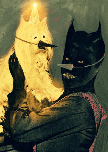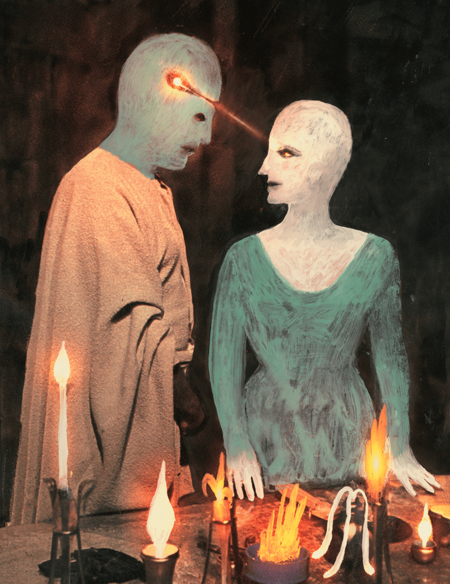 Практически все фотографии, лежащие в основе иллюстраций, черно-белые. Это позволяет Юлии смело играть с цветовой палитрой и огненным светом, контрастирующим с тёмным фоном.
