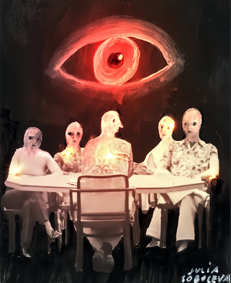 Юлия Соболева создаёт пугающие иллюстрации не только с помощью странных образов. Фигуры в ее работах тесно сгруппированы, заполняют все пространство листа и могут считываться как один паттерн. Такая композиция создаёт ощущение давления, невозможности уединиться или убежать, когда на тебя направлены сразу десятки светящихся нарисованных глаз.