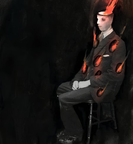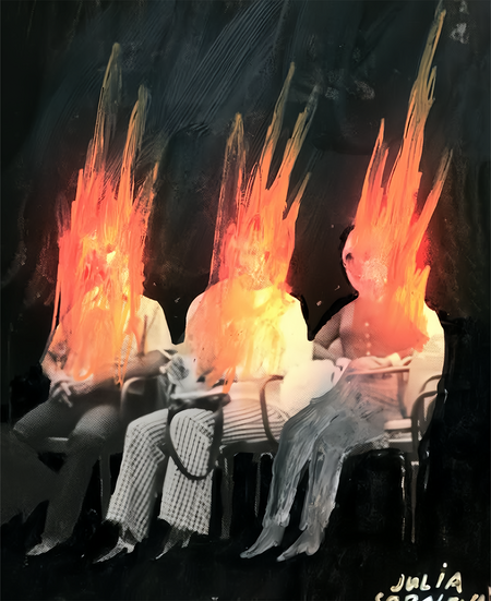 Огонь — одна из основных тем в творчестве художницы. Она изображает его стихией не разрушения, а очищения от травмы. Интуитивный выбор в работе с архивными снимками подтверждает идею горения призраков прошлого, которые отбрасывают тревожные тени на восприятие реальности в настоящем.