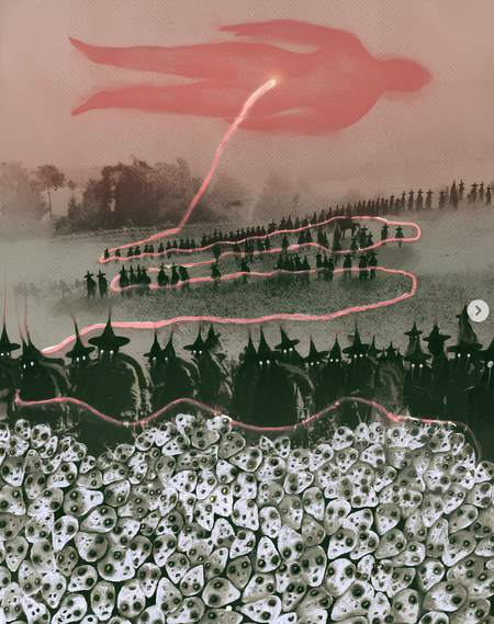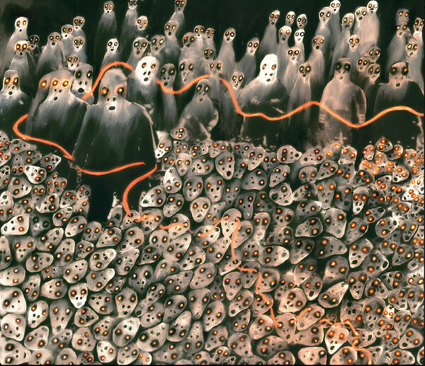 Толпа-паттерн становится еще безумнее, когда художница изображает персонажей с искаженными и похожими по форме и цвету лицами, где одна форма может вытекать из другой. Это подпитывает идею коллективной паники и визуализирует потерянную индивидуальность.