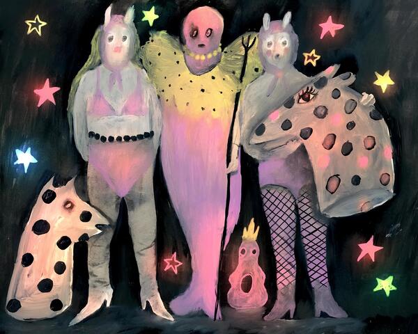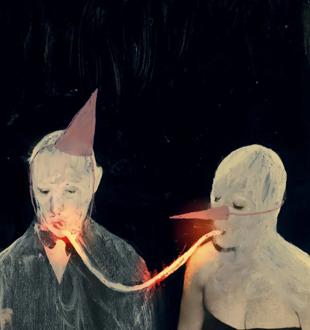 Цепляющие и пугающие работы Юлии Соболевой — это как фрагменты одного большого исследования на пути к исцелению. Сочетающиеся между тёмным фоном «светящиеся» краски, подозрительно улыбающиеся длинноносые маски и птичьи головы, странно контактирующие со вселенной, отсылки к дикой природе и горящий повсюду огонь — все эти детали несут в себе долгую работу над личным стилем и продуманной мифологией, модернизированной под современность. Художница заставляет зрителя нащупывать скрытые смыслы, отбрасывая все привычные правила нашего мира в сторону.
