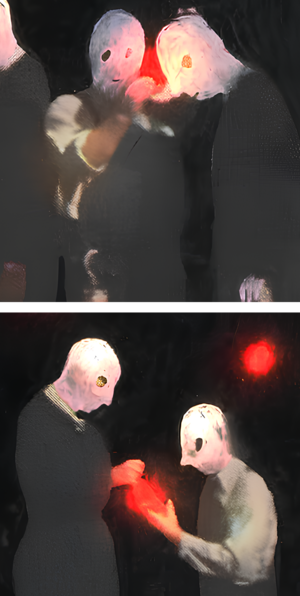 Использование такого приёма, где Юлия соединяет тёмные силуэты в одно огромное пятно-паттерн, позволяет контрастнее выделять маленькие огоньки света, делая их более понятными для зрителя, и говорит о том, что везде можно найти свет, даже в самой непонятной массе.