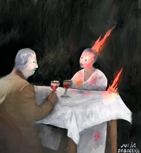 Если говорить об огне и горящих предметах не только как о ключевой составляющей визуального стиля, то можно заметить, что они вносят в сюжеты символическое значение. В иллюстрациях, которые затрагивают темы семьи и личности, скрытый смысл считать проще всего.
