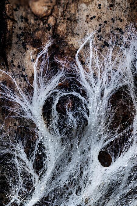 Мицелий минного гриба на влажной деревянной поверхности старого бревна