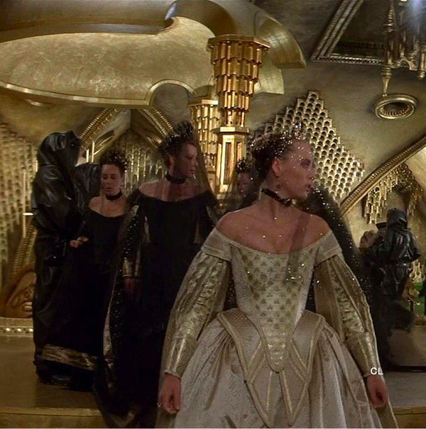 Принцесса Ирулан На самом деле в «Дюне» 84 года нет персонажа, подходящего под архетип «девицы в беде», но у этого архетипа всё-таки другое название — и это «Царевна». Вот для него и подходит принцесса Ирулан. В самом сюжете фильма она не играет практически никакой роли, но появляется в начале и в конце и является рассказчиком в фильме 84 года. После того как главный герой Пол Атрейдес разбирается с домом Харконненов и имперскими войсками, он захватывает трон и требует передать власть. Император выдаёт её за него замуж по просьбе Бене Гессерит, так как Ирулан являлась воспитанницей ордена. Но интересно то, что, несмотря на то что она в начале не следует архетипу — так как сюжет начинается не с того, что её нужно спасти, — в конец она раскрывает вторую сторону этого архетипа: это награждение главного героя, давая тому власть. Она точно повторяет функцию Царевны из сказок. Образ Ирулан интересен тем, что отличается от предыдущих, так как не представляет собой нечто футуристичное, а скорее наоборот — что-то из прошлого. Только по нему нельзя определить, происходит ли действие фильма в средневековом фэнтези или в далёком космосе. Оба наряда, представленные в фильме, показывают её статус: шикарные золотые платья с множеством деталей, с пышными юбками в пол, длинными двойными рукавами — всё это показывает её положение. По сути, она дочь императора — это её роль. В этих платьях она не может ничего сделать, но она и не должна. Её роль, помимо рассказчицы, заключается в том, чтобы выйти замуж за того, за кого решит её отец.Её костюм разительно отличается от удобного альдераанского платья Леи, которая может и от штурмовиков убежать, и при желании в перестрелке поучаствовать.