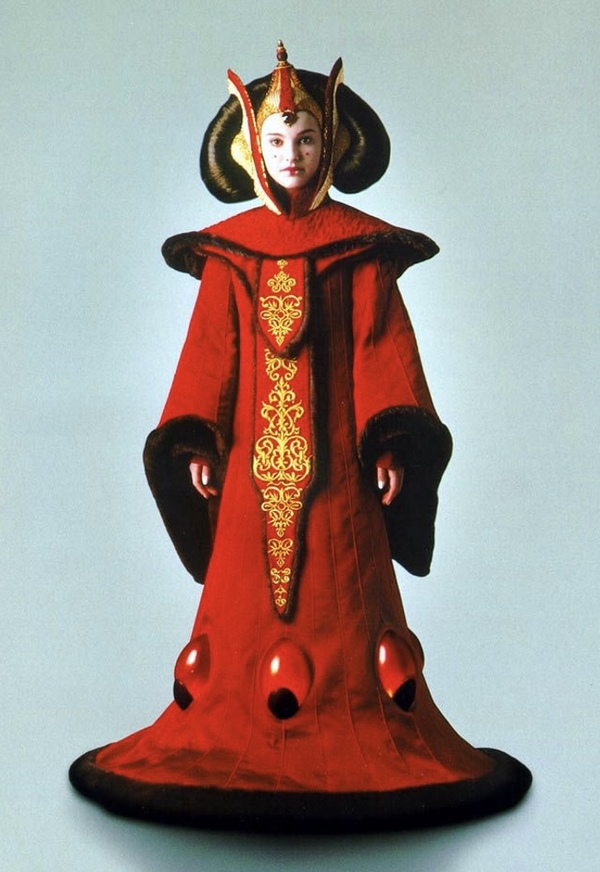 Королева Амидала В 2000-е возвращаются «Звёздные войны» и с ними — монаршие фигуры в фантастике. В первом эпизоде Звёздных войн Падме Амидала является королевой Набу и нуждается в помощи, так что косвенно подходит под этот архетип. Но после 90-х роль Царевны меняется: она не ждёт спасения, хоть и нуждается в помощи. Как и в 90-х, героиня проходит путь спасения вместе с главными героями. Она присутствует в сюжете не номинально, а физически — она действительно что-то делает, чтобы спасти себя и своих подданных. Это ещё одно развитие персонажа: этот персонаж больше не зациклен на главном герое, это не единственная её мотивация. Помочь главному герою в его путешествии — её мотивация это спасти свой народ. Она буквально вклинивается в путешествие, хотя в начале кажется, что её роль будет такой же, как у других «дев в беде», когда её ради безопасности пытаются оставить на корабле. Во втором эпизоде она не настолько ключевая фигура, как в первом, но с её спасения закручивается сюжет — а точнее, с нападения на неё начинается расследование, которое и приведёт к раскрытию создания клонов и столкновения с сепаратистами. Как и в случае с Лилу, в лице Падме происходит большое развитие этого архетипа, но не в плане важности в сюжете, как у Лилу. Здесь развитие в другом: теперь у «девы в беде» есть личность. У неё есть интересы помимо главного героя, у неё есть мотивация. Её поступки определяются не главным героем, а её собственными желаниями и чувствами. Что касается её образов, то они многообразны и зависят от того, кем она предстаёт: Её платье королевы, вдохновлённое различными азиатскими культурами, нужно, когда она играет роль серьёзного правителя при встрече с Федерацией. Оранжевое платье с капюшоном служанки — чтобы спрятаться от глаз и смешаться с другими слугами. И конечно, простая сине-серая одежда для путешествия по неблагополучной планете или чтобы пробраться во дворец — именно она даёт ей свободу действий, она максимально отходит от своей роли королевы в этой одежде