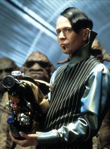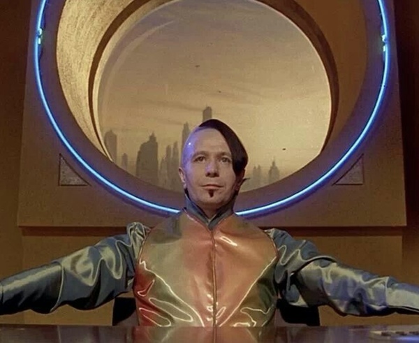 Здесь он человечнее прошлых персонажей архетипа антагониста, поскольку он не имеет сверхъестественных сил, и его мотивация меняется: это не просто жажда власти — у него есть идеология, то что хаос создаёт движение и жизнь, в то время как спокойное существование держит всё на месте. Он практически не выполняет основных функций антагониста, так как ни разу не видится с героем и даже не знает о нём. Его цель — это добыть камни, и ради этого он убивает, но не только ради этого: иногда он убивает, чтобы наказать глупых союзников. В 90-е в космоопере происходит скачок развития этого архетипа — одновременно и упрощение его. Так, «Пятый элемент» показывает злодея-человека с идеологией, чья цель никак не связана с главным героем или властью, и «вселенское зло», которое максимально упрощается, настолько насколько это возможно. Его образ тоже разительно отличается от прошлых образов злодеев: в его одежде есть цвет, она не сплошь чёрная, а разноцветная, переливающаяся между бирюзовым и золотым; у него дорогая, красивая одежда, которая показывает его статус, то что у него есть деньги, и как человек он может потратить их на себя.
