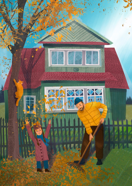 Вторая иллюстрация показывает, как эта связь воплощается в действии. Совместный труд — это практическое выражение заботы, взаимопомощи и разделенной ответственности. Через такие будничные дела и передаются традиционные ценности, воспитывается любовь к родному очагу и формируется активная, созидательная жизненная позиция.