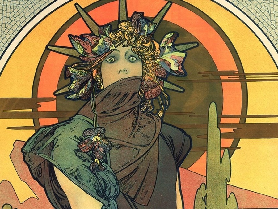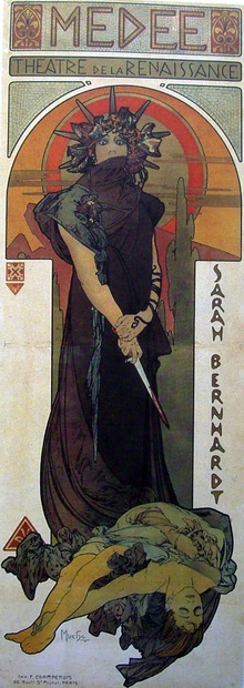 Завершение образа Медеи, начатого в предыдущей картине, показывает Альфонс Муха. В его работе героиня застыла в неуверенной и неловкой позе, но главное — это её лицо. Широко открытые глаза смотрят прямо на зрителя, а внизу, у её ног, лежат безжизненные тела детей. Этот образ представляет собой пик безумия и становится логичным завершением всей трагедии.