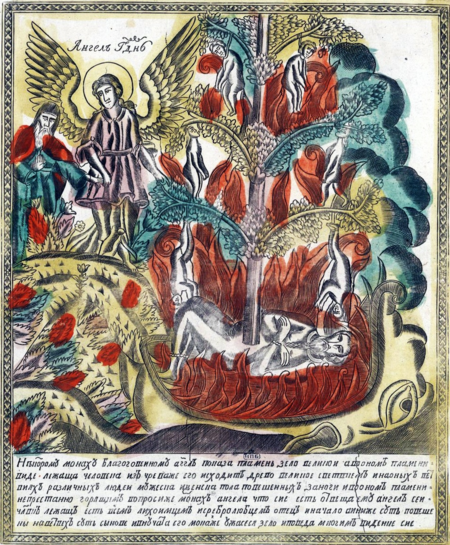 Анализ изображения: данный лубок демонстрирует аллегорическую композицию наказание грешников. Центральный персонаж прикован к горящей лодке, дерево, расположенное над ним, с висящими фигурами отображает расплату за грехи. Слева праведник и ангел, следящие за действием. Снизу композиции находится текст, объясняющий заслуженное наказание. Это изображение призвано наставлять на верный путь, через устрашение и дидактику.