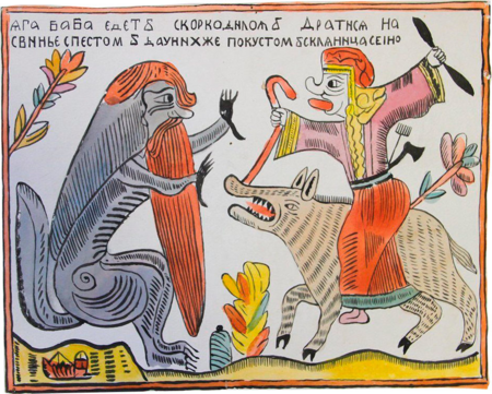 Анализ изображения: Фольклорный лубок с гротескным преувеличением персонажей. Композиция представляет собой противопоставление человека в народном костюме, верхом на кабане и существа с длинной красной бородой. Цветовая палитра достаточно яркая. Пространство заполняют орнаментальные элементы. Также в верхней части композиции присутствует текст на старославянском языке, который задает нарративный контекст.