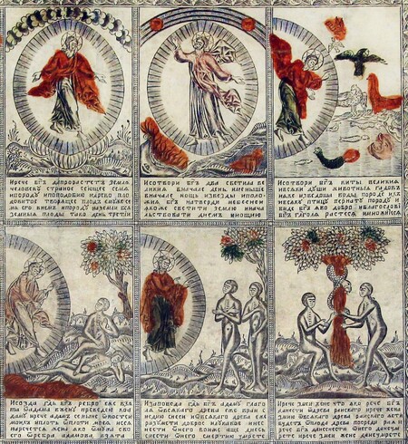 Анализ изображения: На данном лубке изображена народная интерпретация библейской истории Адама и Евы. Ангел обращается к первым людям, над его головой изображен геометрический стилизованный нимб. Также композиция наполнена стилистическими элементами, такими как растения, солнце, луна и звезды. Цветовая гамма достаточно выразительна, фигуры изображены без анатомической точности, что является характерной чертой для народного творчества. В композиции присутствует текст на старославянском языке, он создает целостность пространства за счет обрамления по краю.