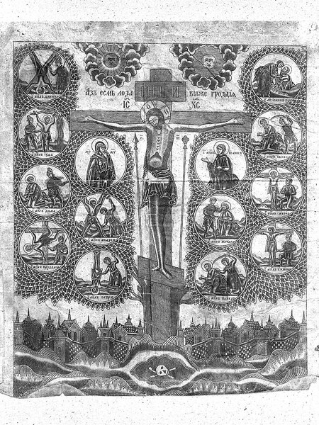 Анализ изображения: сложная композиция, центром которой является сцена распятия, вокруг располагаются виньетки с библейскими событиями и святыми в круговой форме. Данный пример является «иконным» типом лубка, он служил заменой дорогостоящих икон для бедного населения. Гравировка детально проработана, мы можем увидеть многослойное повествование за счет символических элементов, таких как череп, городской пейзаж, кресты.
