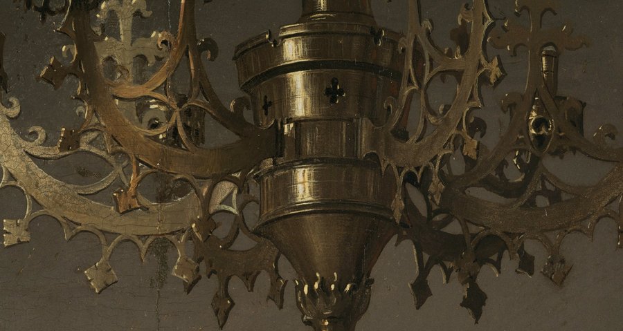 В работах Ван Эйка мелкие детали материалов, поверхностей и объектов (ткань, мех, металл, блики) функционируют как визуальные якоря, которые притягивают и удерживают взгляд. Они замедляют восприятие, заставляя зрителя рассматривать изображение дольше и внимательнее.