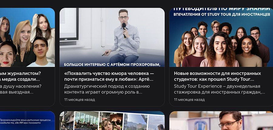 (Медиасеть «Яндекс Дзен», интерфейс с карточками статей и видео, 2025 г.) https://dzen.ru/hsemedia (Дата обращения: 20.11.2025)