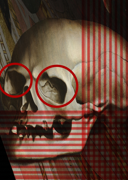 Ганс Гольбейн Младший, «Послы», 1533 г. 1. Изобр: (Фрагмент) 2. Изобр: (Восстановленное изображение черепа с картины, полученное путем поворота изображения под косым углом)