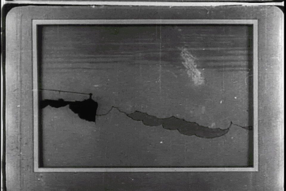 Ничто с такой силой не отражает природное начало, как морская стихия, однако здесь она спокойна и умиротворенна. Гладь воды большую часть времени слегка колышется, и только в районе взрыва поднимаются и бушуют волны. Природа совершенна, а человек техногенным воздействием нарушает её покой: торпеды разрывают морскую гладь, распугивая рыб и стремительно надвигаясь через диагональ кадра, и дым от взрывов заволакивает статичное и светлое небо, затемняя его пространство по тону и создавая сложные контрформы.