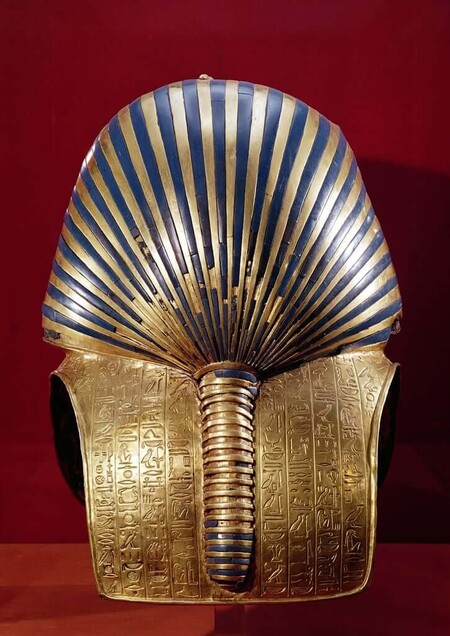 Погребальная золотая маска фараона Тутанхамона (18-я династия, правление Тутанхамона (1327–1318 до н. э.) Золото, лазурит, стеклянная паста, обсидиан, бирюза