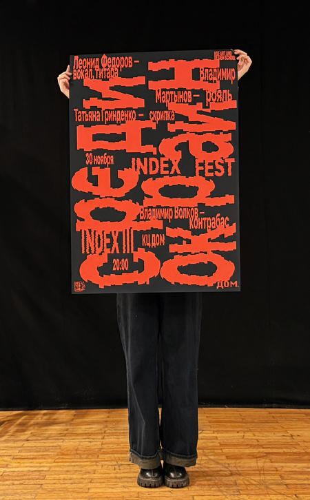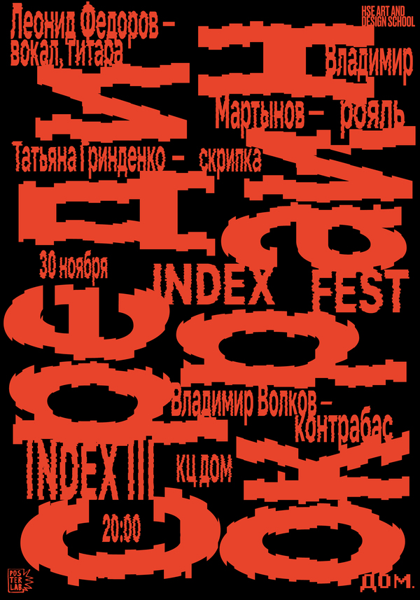 Плакат для INDEX FEST и выступления на нем «Среди окраин» 30.11.25. Сделан по средством видоизменения шрифта. Пикслельные колебания типографики и слова, которые перетекают друг в друга создают визуальный образ музыки и подчеркивают необычность и экспериментальность музыкального события.