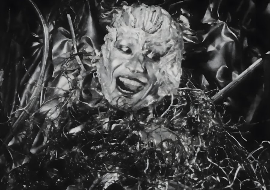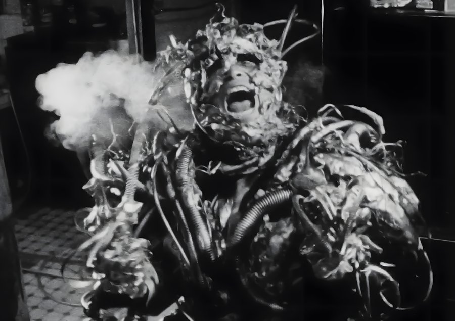 Фильм — Видеодром; Режиссёр — Дэвид Кроненберг; Основу всех практических эффектов фильма составляет пластический грим, накладки и элементы грим-костюма сделанные из латекса, силикона, пластмассы и поролона, также в фильме используется аниматроника; Супервайзер визуальных эффектов — Рик Бэйкер;