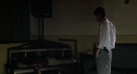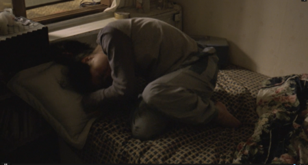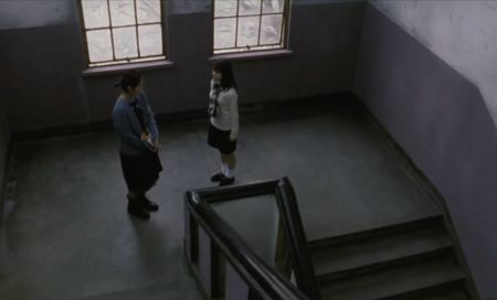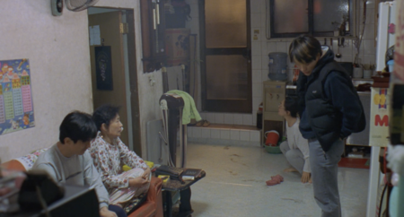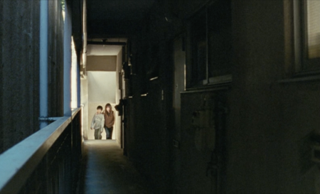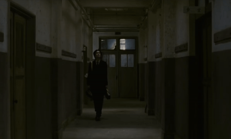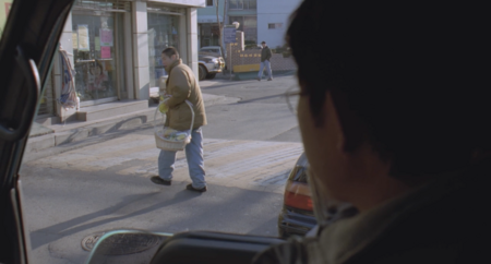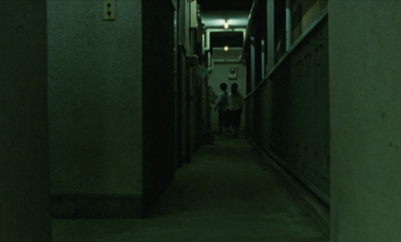 В «Оазисе» Ли вовсе не опирается на длинные статичные планы — напротив, камера часто подвижна, наблюдательна, иногда нервна. Она следует за героем, фиксируя его неловкость и социальную уязвимость. Пустота пространства возникает не из длительности, а из композиции: голые стены, узкие коридоры, пустые лестничные клетки, обособленность от толпы создают ощущение изоляции, в котором персонаж выглядит маленьким и потерянным. Эти пространства не поглощают героя медленным временем кадра — они давят на него своим обнажённым, социально бесприютным характером.