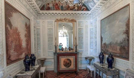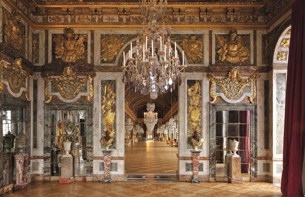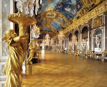 Если говорить конкретно про Францию, то французские интерьеры XVIII века — например, Интерьеры дворца Версаль при Людовике XVI — демонстрируют тонкую работу с полихромией. Колонны и пилястры часто окрашивались под мрамор, но выбор палитры оставался мягким: белый, кремовый, бледно-зелёный. Гризайль использовался в основном для создания античных мотивов на фризах и плафонах. Золочение встречалось умеренно, как декоративный акцент на мебели, карнизах и рамах зеркал.