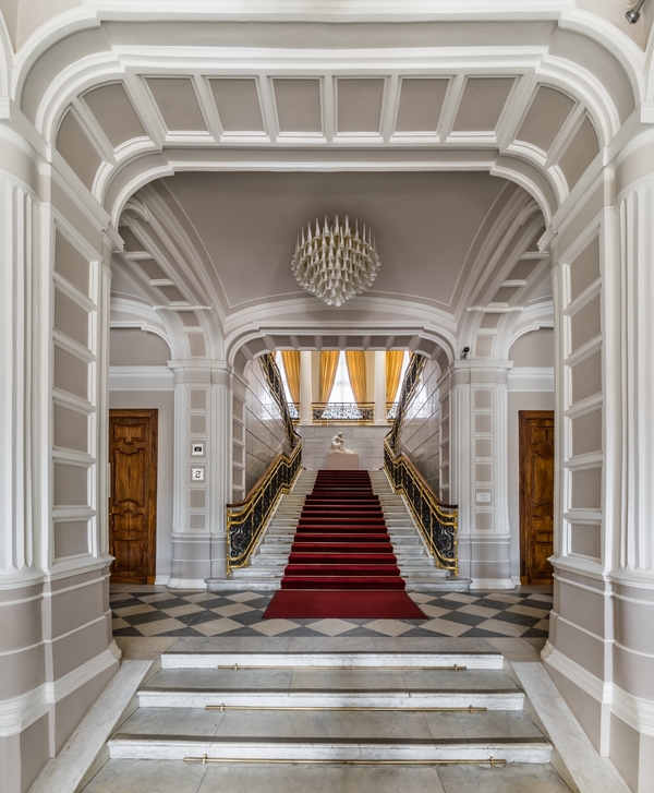 Вдоль парадной лестницы Шуваловского дворца в Санкт-Петербурге стены расписаны под красный и серый мрамор. Фактически это деревянные панели с многослойной штукатуркой и краской. Контраст оттенков помогает формировать ритм лестничного пространства и подчёркивает парадность интерьера.