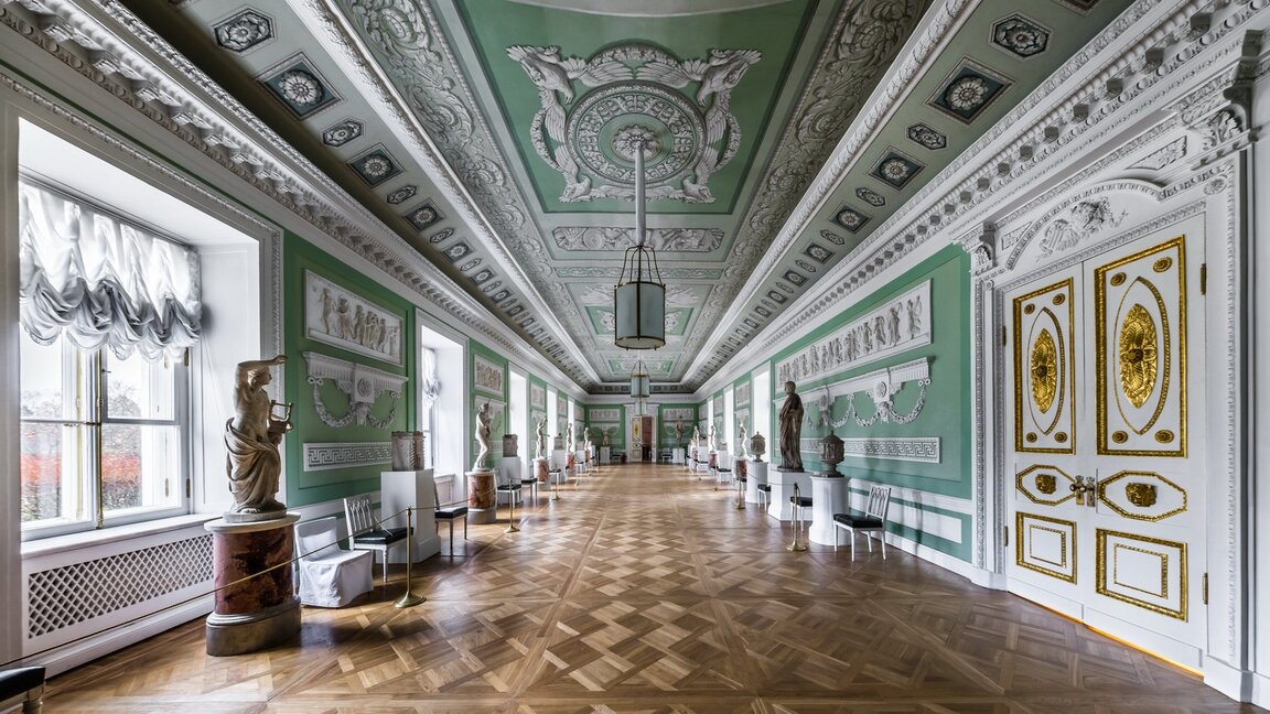 Например, Греческий зал Павловска использует зелёные колонны, белый фон, золотые детали мебели — сочетание, которое в Европе выглядело бы перегруженным, в России воспринимается гармонично из-за размера и парадности зала.