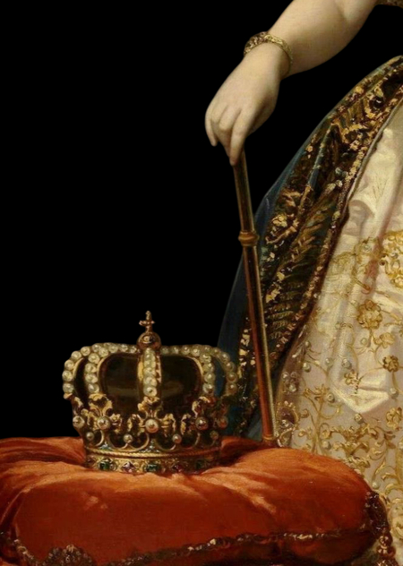 Здесь мы снова видим знакомый набор: коронационные регалии, колонна, трон, тяжёлая мантия. Но есть важные нюансы: подчеркиваются многократные титулы: корона и другие знаки власти отсылают к тому, что Мария-Терезия — не только императрица, но и королева Венгрии; силуэт трактован более спокойно, с меньшим барочным пафосом, чем у Людовика XIV; внимание сосредоточено на сочетании королевского достоинства и женской респектабельности.
