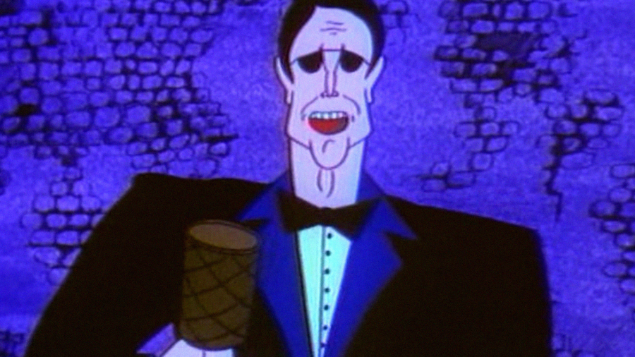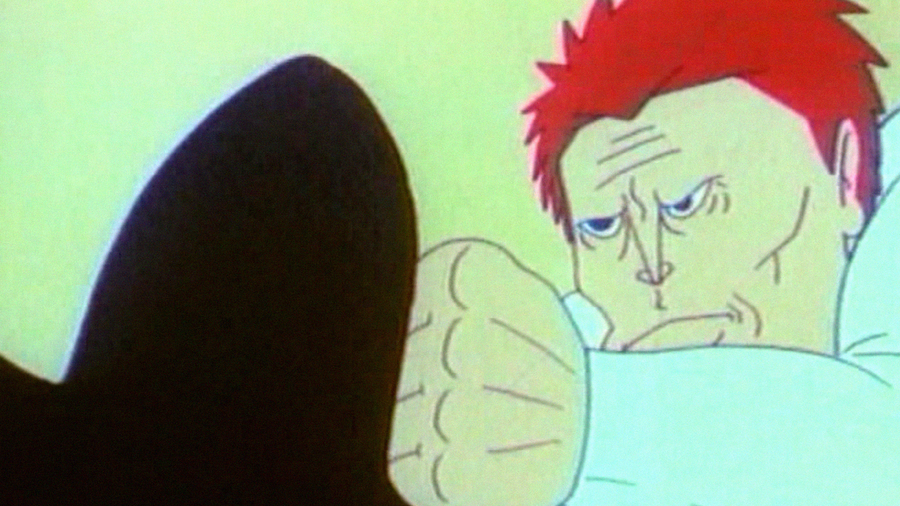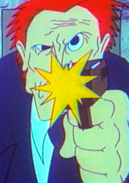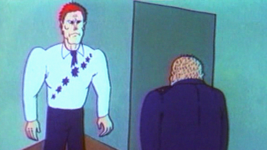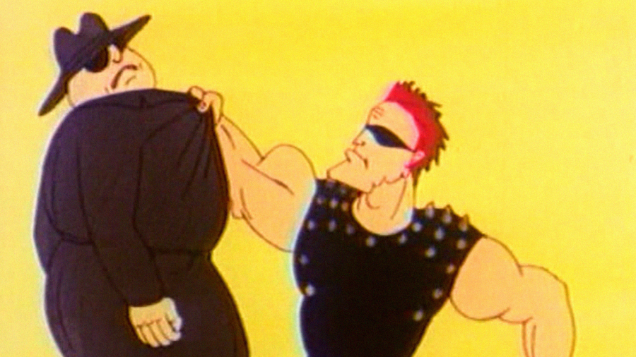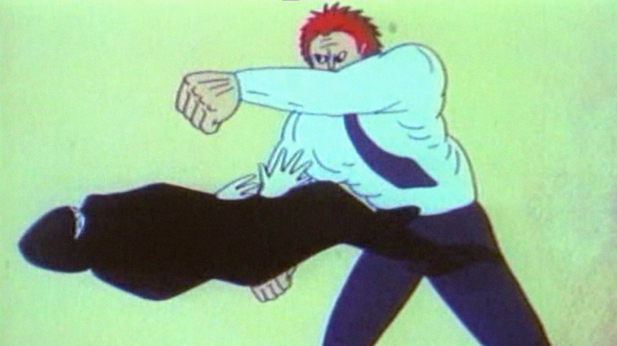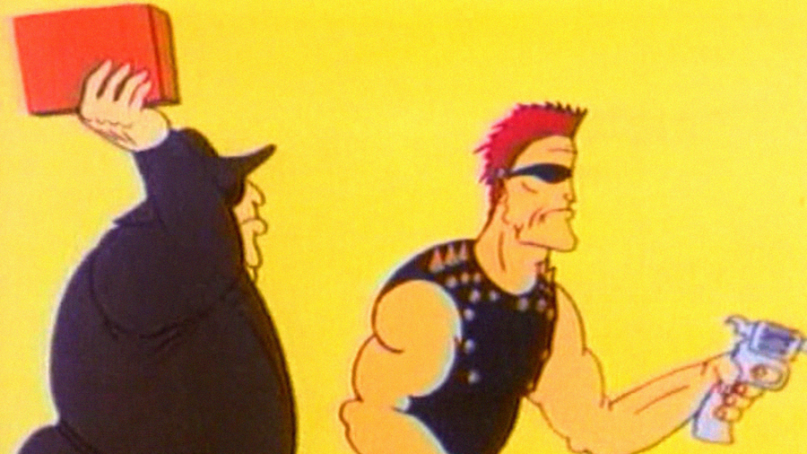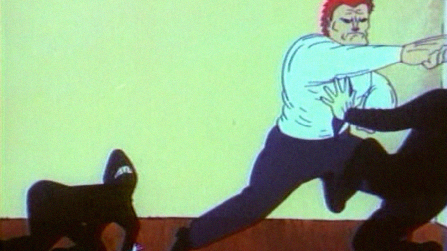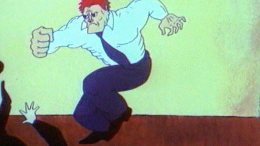 Такая гиперболизация усиливает драматизм и комичность одновременно: тело героя становится инструментом визуальной выразительности, а действия — легко читаемыми и узнаваемыми. Противники также показаны в динамичных ракурсах, что позволяет зрителю сразу определить их роль в сцене и воспринять сюжетный конфликт. Приём демонстрирует, как российская анимация начала 90-х осваивает западные визуальные практики, сохраняя при этом собственный комический и ироничный характер.