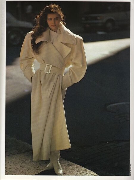 В продолжении к костюмам появились женские пальто и плащи, способствующие формированию профессионального статуса в том числе вне офиса. Верхняя одежда создавала дополнительный объём, что визуально увеличивало силуэт, и считывалось как статусность в формулировке «доспехов» в женской одежде.
