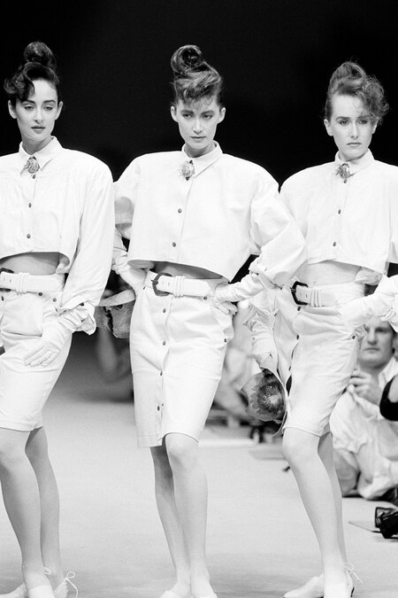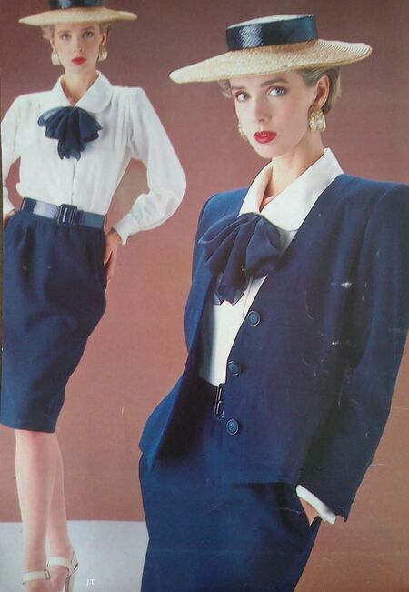 К концу 1980-х годов эволюция power suit демонстрирует кардинальный сдвиг в стратегии самопрезентации деловых женщин. Если ранние версии костюма дословно воспроизводили мужские силуэты, то к концу десятилетия происходит решительный поворот к женственной эстетике: жакеты укорачиваются, палитра обогащается смелыми цветами и принтами, а длина юбки сознательно поднимается выше колена, иногда трансформируясь даже в комбинацию с шортами.