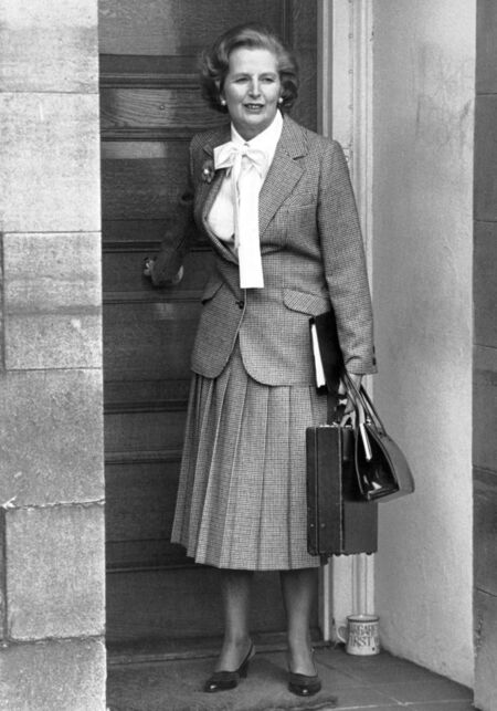 «Железная ледие» Маргарет Тэтчер, первая женщина-премьер Англии, представляет феномен «контролируемой мимикрии». Ее тщательно сконструированный имидж — костюмы с мягкими подплечниками, струящиеся юбки-карандаш, элегантные сумки-портфели — функционировал как «доспех» политической легитимности, но при этом сознательно избегал радикальных форм. Акцент на британских брендах и классических силуэтах позволял ей одновременно утверждать власть и соответствовать ожиданиям консервативного общества.