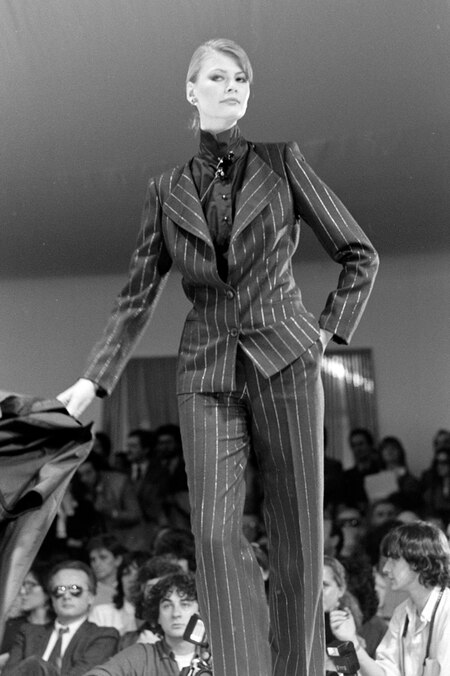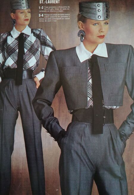 В 1980-е годы брючный костюм был мощным инструментом социальной коммуникации, power suit являлся символом новой корпоративной роли женщины. Классический power suit включал структурированный пиджак с широкими подплечниками и прямым силуэтом, а также юбку или брюки строгой формы. Подплечники создавали визуальный «каркас» авторитета, усиливая верхнюю часть фигуры и формируя силуэт, традиционно ассоциировавшийся с властью, крой брюк удлинял силуэт, позволяя женщинам выглядеть выше и статнее, также костюмы зачастую выпускались в нейтральных цветах, например, в черный, темно-синий и серые оттенки и дополнялись скромными аксессуарами.