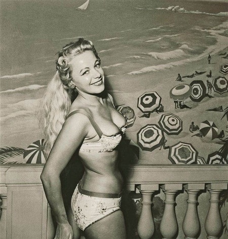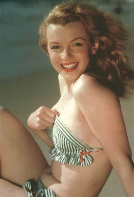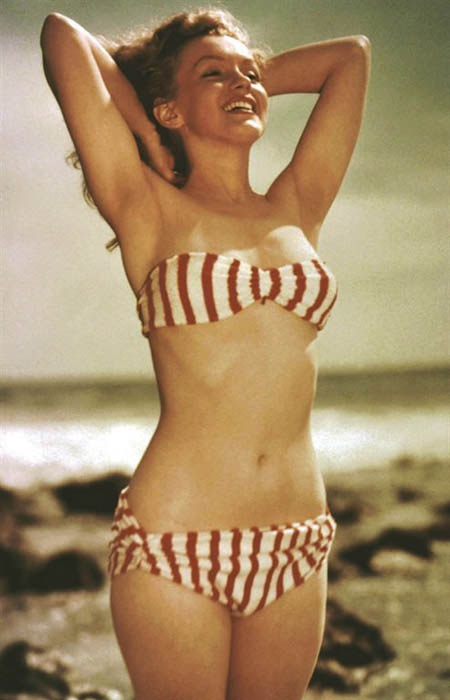 Мэрлин Монро в голубом бикини в горошек, 1951 год.