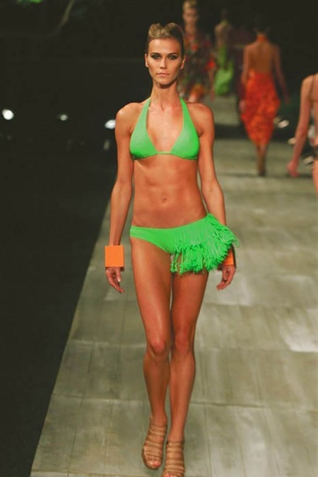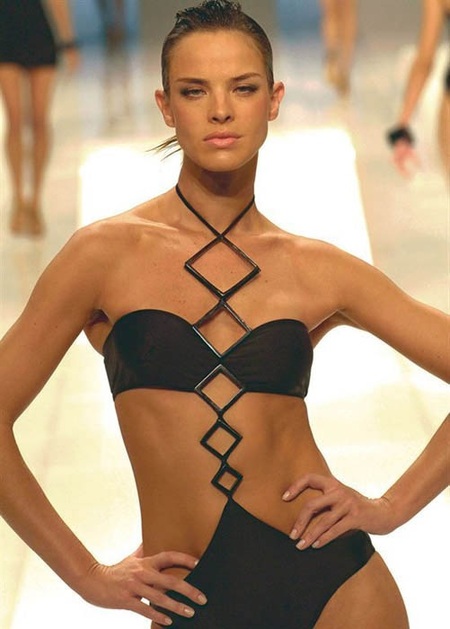 1. Летисия Биркхойер, черной купальник с геометрическими элементами, 2000 год. 2. Карли Клосс, бикини ярко-зеленого цвета с бахромой из коллекции Diane von Furstenberg, весна-лето 2013 год.
