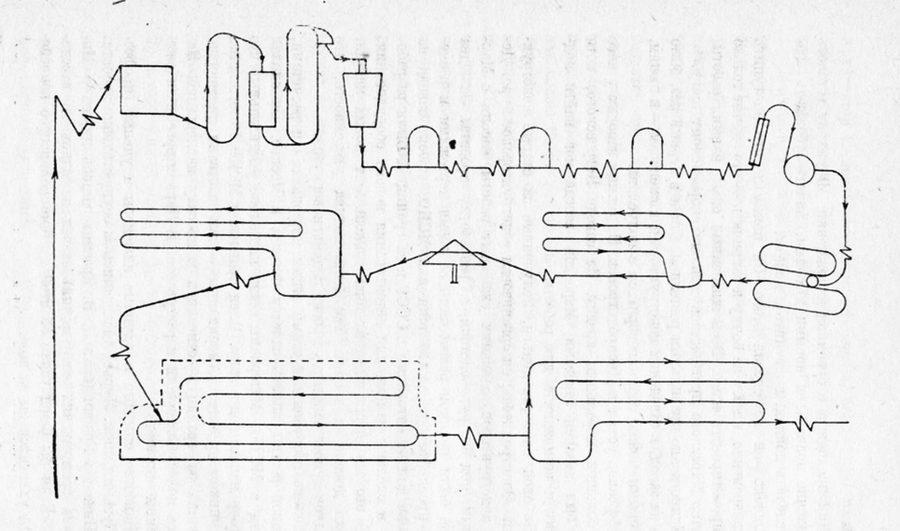 Схема прямого поточного производства хлеба на американском заводе. Разнообразные средства транспорта определяют эту сложную систему прямолинейно-возвратных движений.