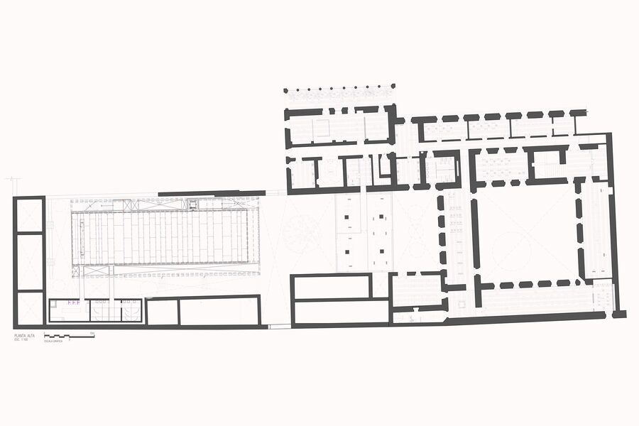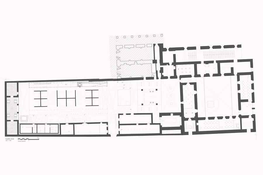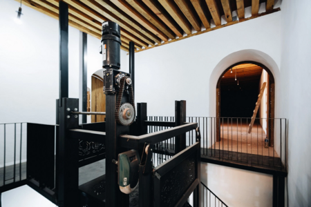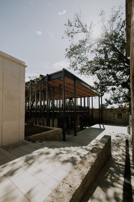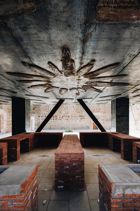 В то время как основное здание монастыря было бережно отреставрировано с использованием традиционных материалов, в его пространство были внедрены современные элементы. Наиболее ярким примером является объем из натуральной стали, приподнятый над землей, в котором разместились промышленные кухни.