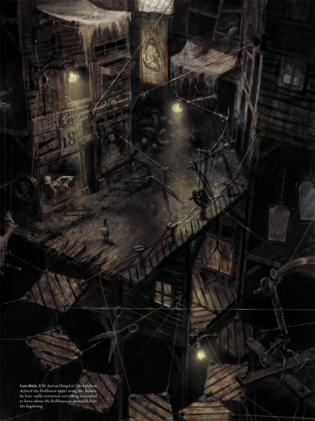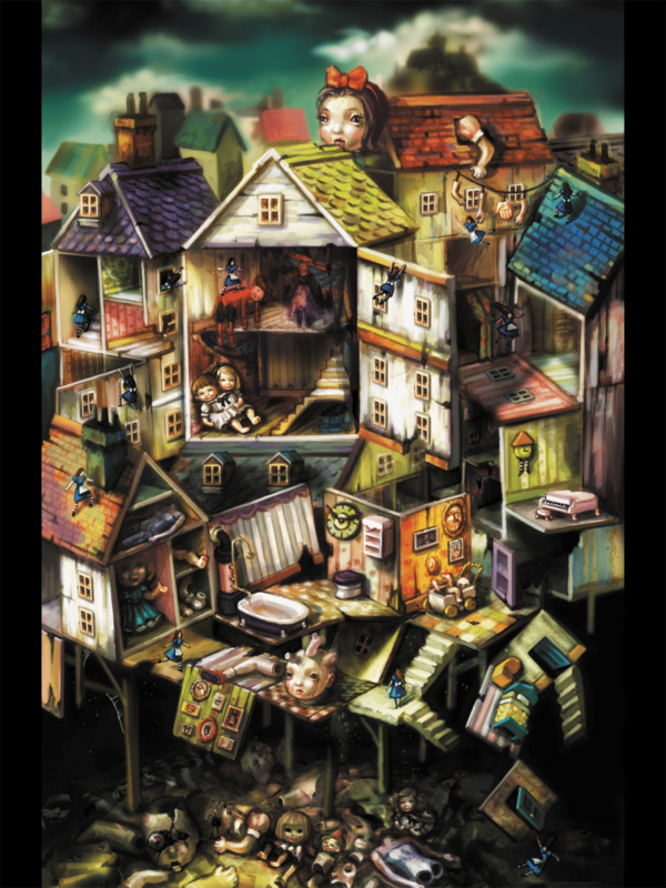 И это не случайно. Современный, темный и кошмарный мир «Алисы» еще на концепт-страницах определяется в своем гротескном самосознании. Архитектура вычурно-готическая; артефакты грязных улиц не просто реалистично показаны то тут, то там, но гиперотрофированно раскиданы по каждому уголку, попадаясь зрителю куда бы он ни глянул; даже жители города играют свою декоративную роль, представляясь чуть меньше людьми и чуть больше продуктом города — такие же чудовищные, искривленные, грязные.