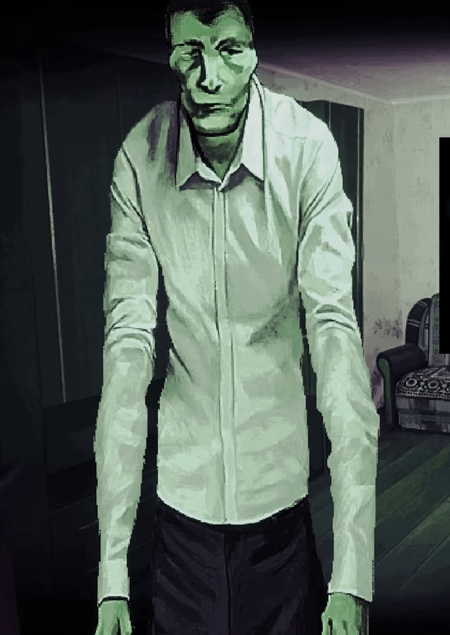 Изображенная героиня No, I’m Not a Human обладает нарративной мистичностью. Визуально на ее принадлежность к культу указывает свойственная подобным темам палитра (насыщенный фиолетовый в комбинации с желтым), достаточно плавное, на фоне других персонажей, лицо и накидка. Достаточно карикатурный и стереотипный образ. Настолько, что будто одной лишь своей типичностью она приоткрывает новый пласт внутриигровой реальности.
