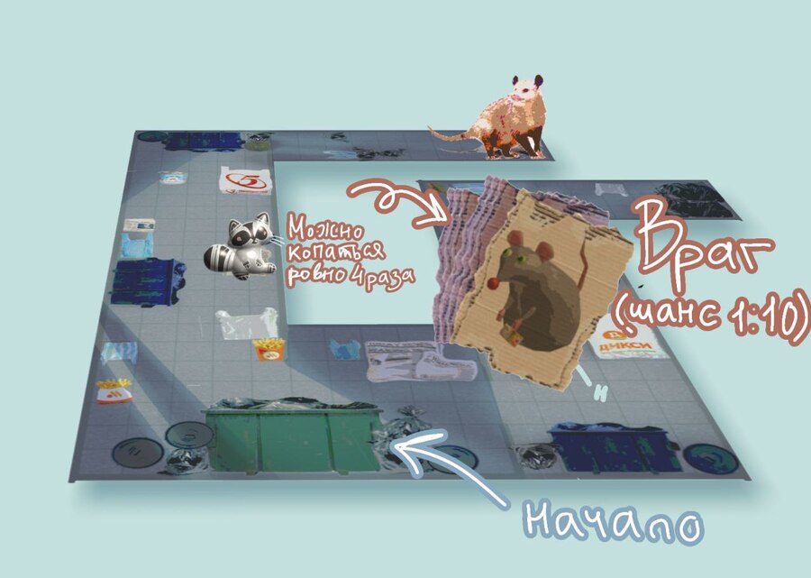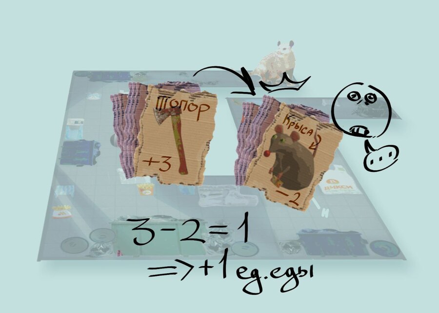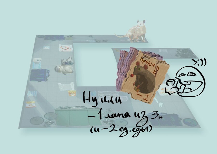 Но будьте бдительны — жителям этих улиц может быть неприятно. Отбивайте их атаки при помощи своих колод с карточками боя (что лежат в колоде карт для нычек). Если вас все-таки покусали, то лечитесь при помощи пластырей, иначе придется сократить свои ходы до 2х, да и еды меньше сможете унести (не более 15 и 10 ед. в зависимости от кол-во ранений). Всего можно получить по лапам 3 раза, потом выбывание из игры.
