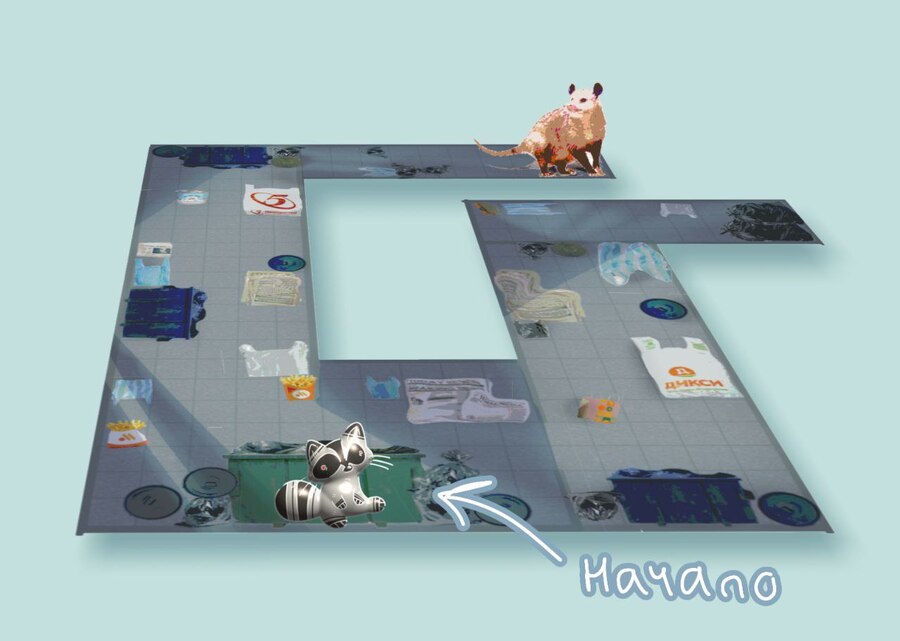 Игра начинается на поле в свалке, откуда вы (фишки ракунов) дальше можете ползти 3 хода в любом направлении (шаги можно регулировать от 1 до 3). Копайтесь в мусорках, газетах, пакетах и люках, что лежат на поле, подбирая ед. еды (беря миниатюры еды в свой мешок чтобы потом подсчитать их). На месте можно копаться столько раз, сколько клеток занимает нычка.