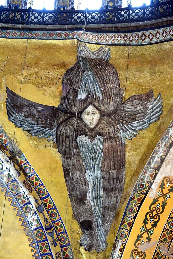В мозаике Hagia Sophia, например, в куполах изображены шестикрылые ангелы — возможно, серафимы или херувимы, «охраняющие» престол Божий. Такой образ явно уводит художника и зрителя за пределы земного мира, создавая ощущение небесного присутствия. Византийский художник, через композицию, цвета и положение ангельских фигур, задаёт тон не материалистический, а трансцендентный: ангелы «витают» на фоне золота, света, небесного фона — вне конкретного времени и пространства земного.